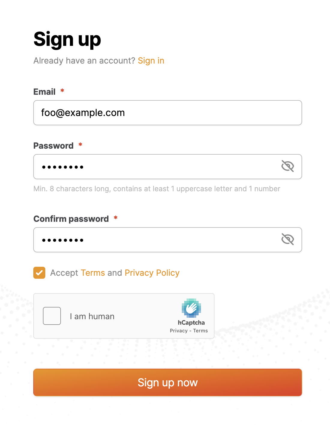 Click the link "Sign up now" on the sign-in page, , which redirects you to the sign-up form.